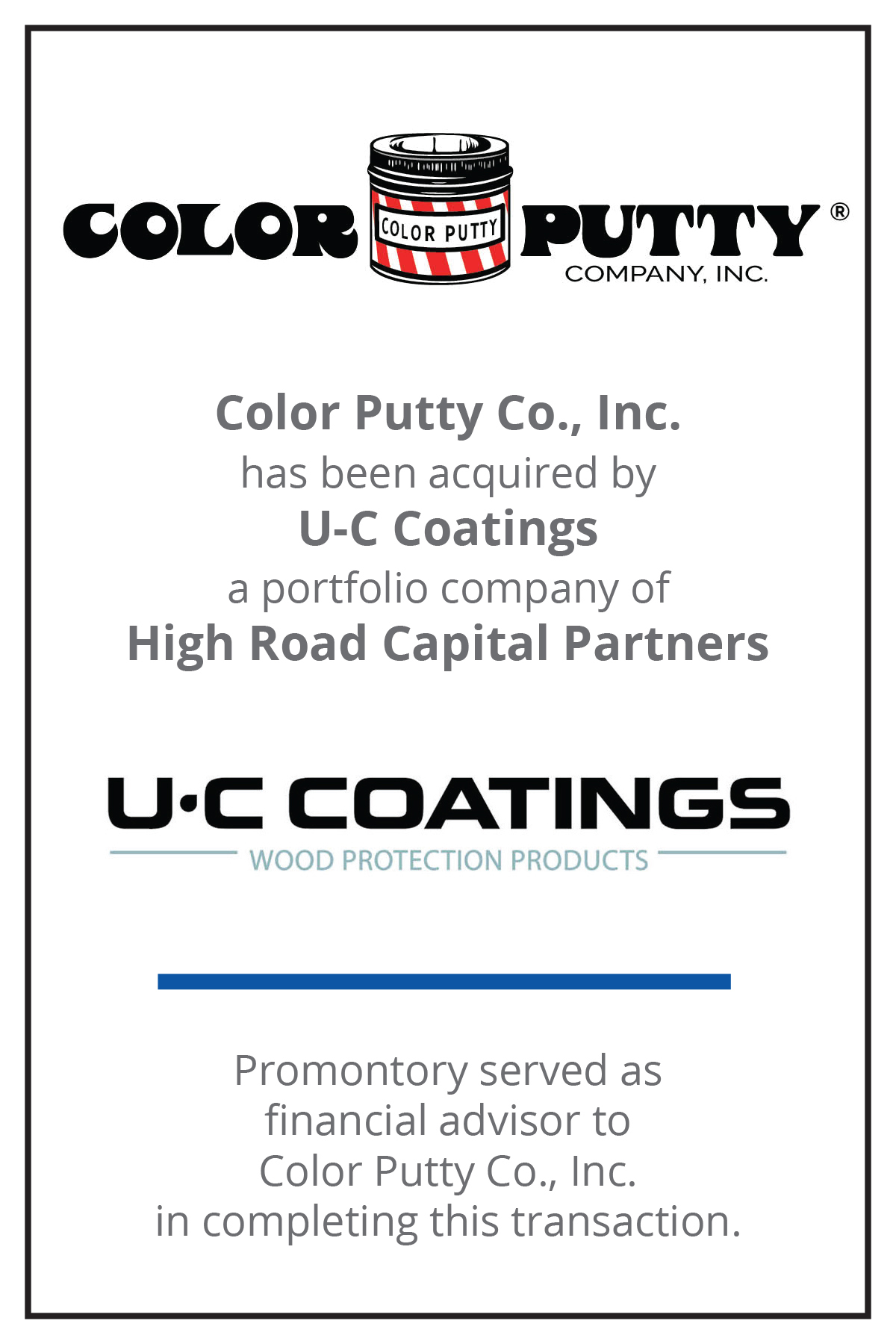 “We had the great pleasure of working with Promontory and highly recommend their services. Every aspect of the sale of Color Putty Company was made smoother with the professionalism exhibited by Chris and Promontory.